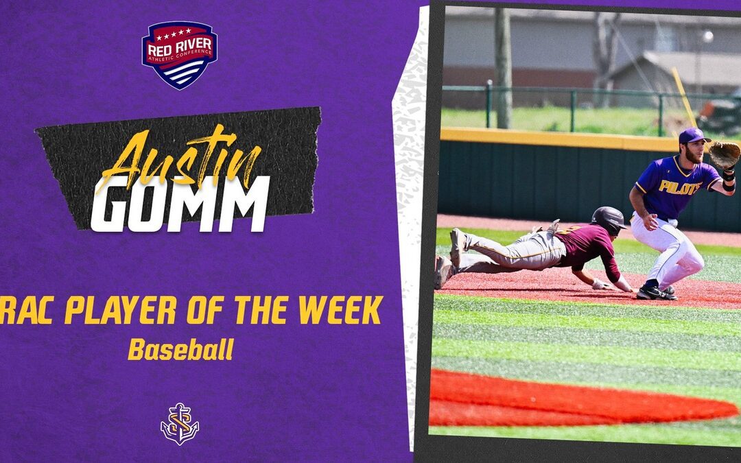 Austin Gomm had eight hits, a walk, nine RBI and a stolen base to help No. 1 LSU Shreveport to a 4-0 week. He went 4-for-4 with two triples and three RBI as the Pilots downed Texas Wesleyan in a midweek game. For his strong play, Gomm was named the Red River Athletic Conference Player of the Week.